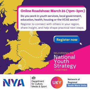 If you missed the South East regions Youth Matters: Your National Youth Strategy Roadshow, theres an opportunity to sign up to this online session with Department for Culture, Media and Sport UK Youth National Youth Agency The National Youth Strategy sets out a bold ten‑year vision for young people, shaped by the voices of over 14,000 young people across England and grounded in the realities they face today – from mental health and cost‑of‑living pressures to access to safe spaces,